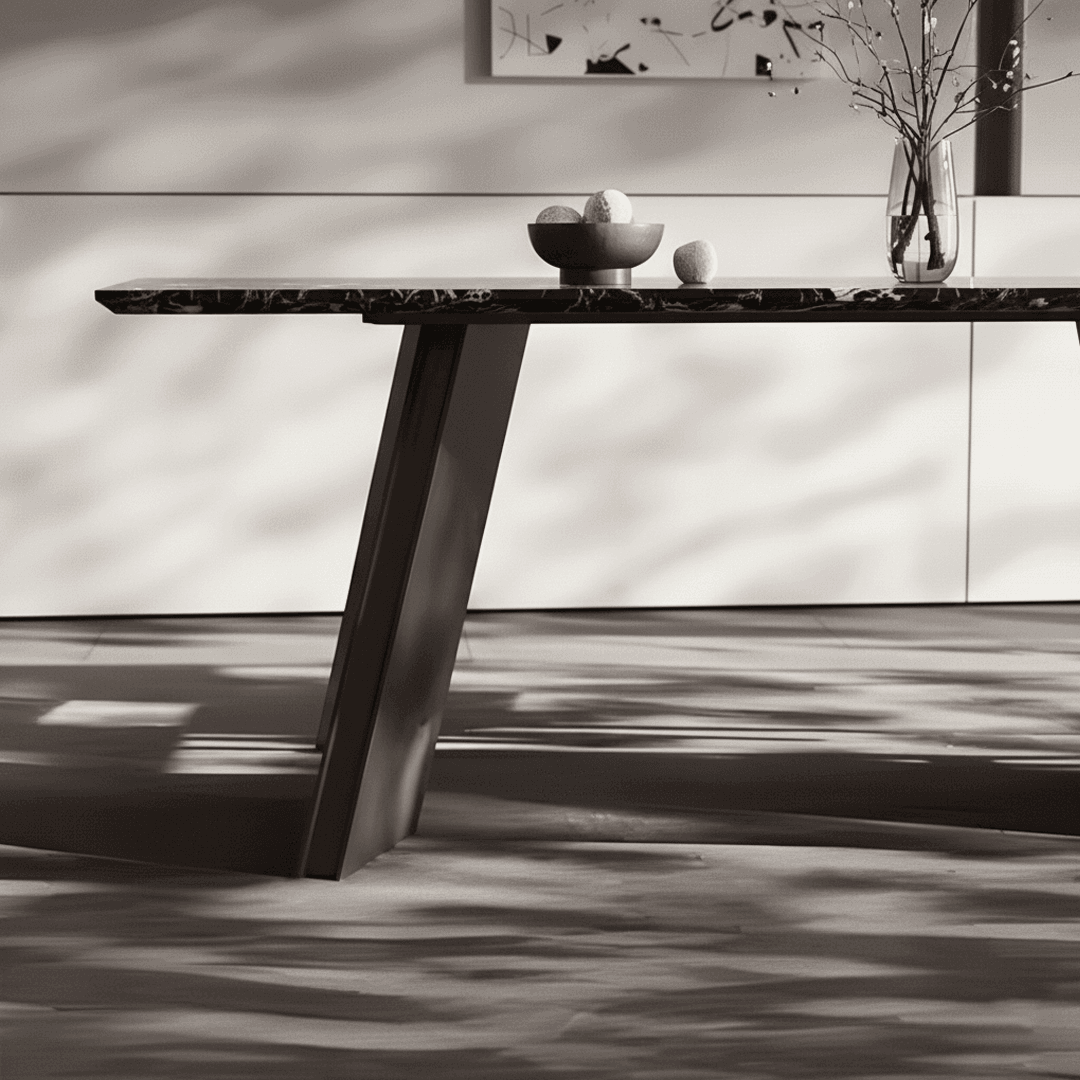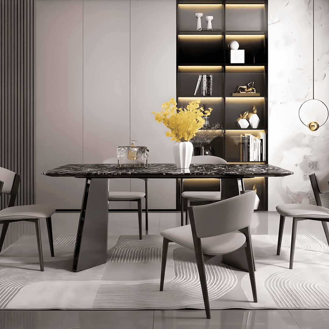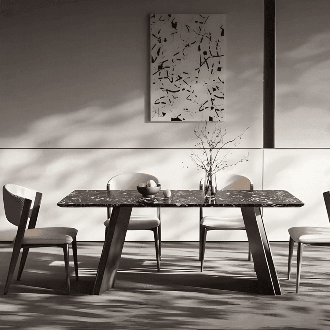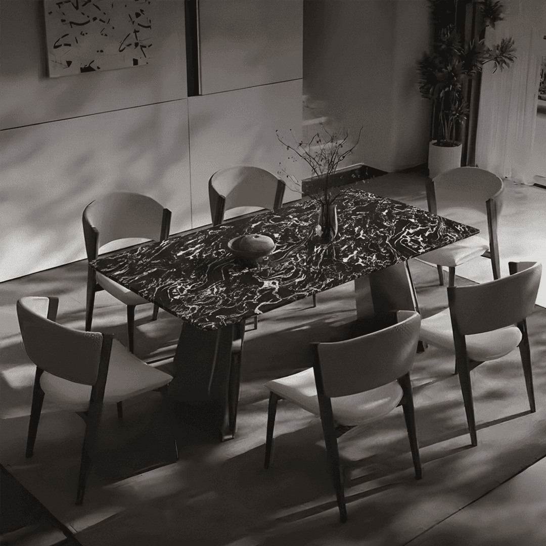 This elegant rectangular dining table commands attention with its dramatic black sintered stone top, intricately veined with striking white patterns that create a mesmerizing contrast. The polished surface offers a luxurious feel and a reflective quality, enhancing the sense of space and sophistication in the dining area. Supported by a pair of sleek, minimalist pedestals that seamlessly blend with the tabletop’s darker tones, the table exudes a contemporary yet timeless appeal, making it an ideal centerpiece for modern interiors.