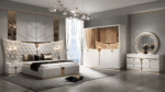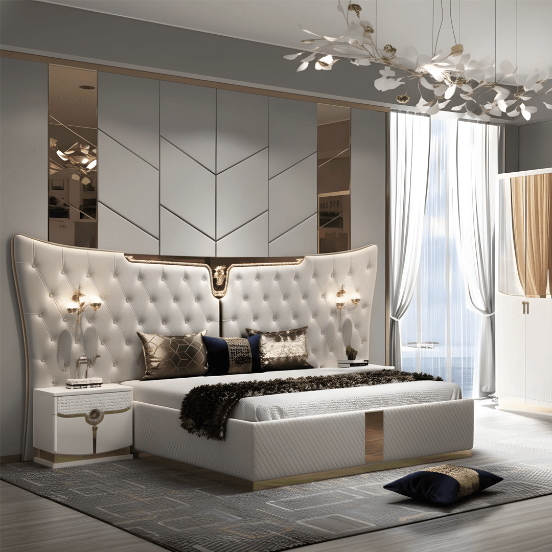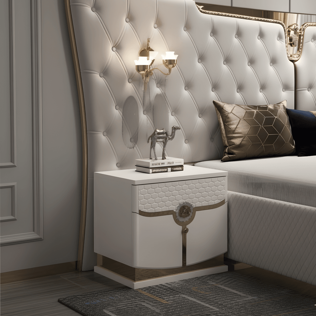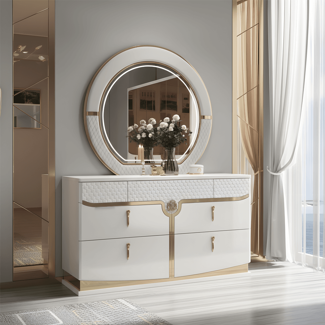 Bring a breath of fresh elegance into your home with the Coastal Bedroom Set, a luxurious import from Dubai crafted from premium HDF material. This stunning set features a unique, tufted headboard with gentle curves and gold accents, evoking the serene sophistication of a high-end coastal retreat. The soft white palette, paired with shimmering details and a round illuminated mirror, creates a light, airy ambiance that instantly uplifts any space.