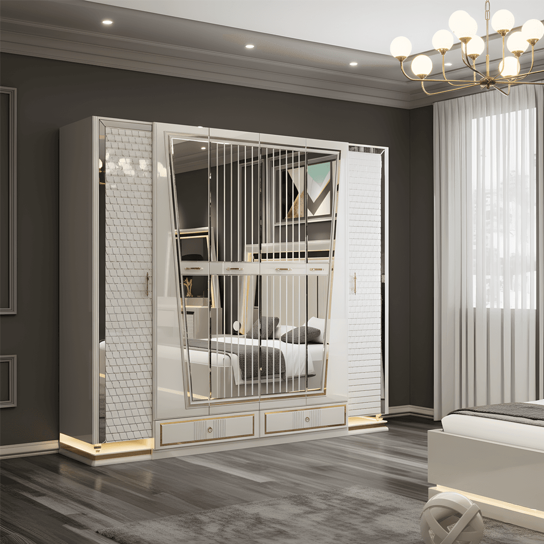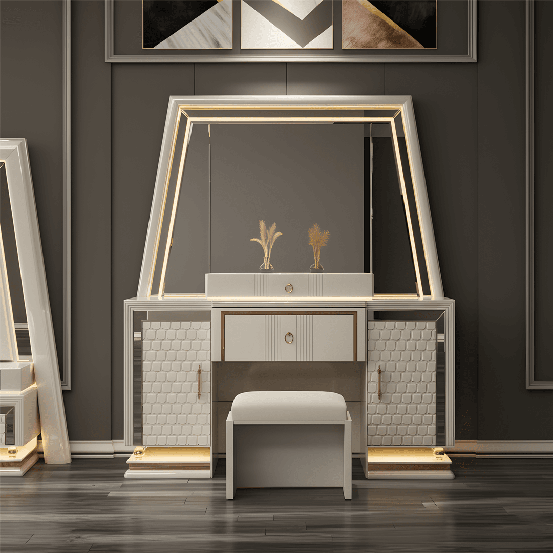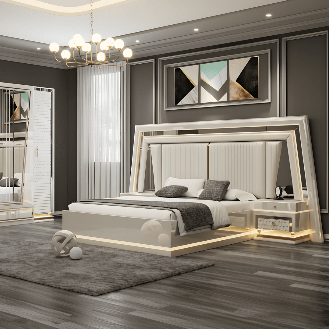 Transform your bedroom into a haven of modern luxury with the Driftwood Bedroom Set, a premium import from Dubai. Expertly crafted from high-quality HDF material, this set stands out for its sleek geometric design, elegant textures, and minimalist sophistication. The crisp white finish and subtle metallic accents create a fresh, airy ambiance that elevates any living space.