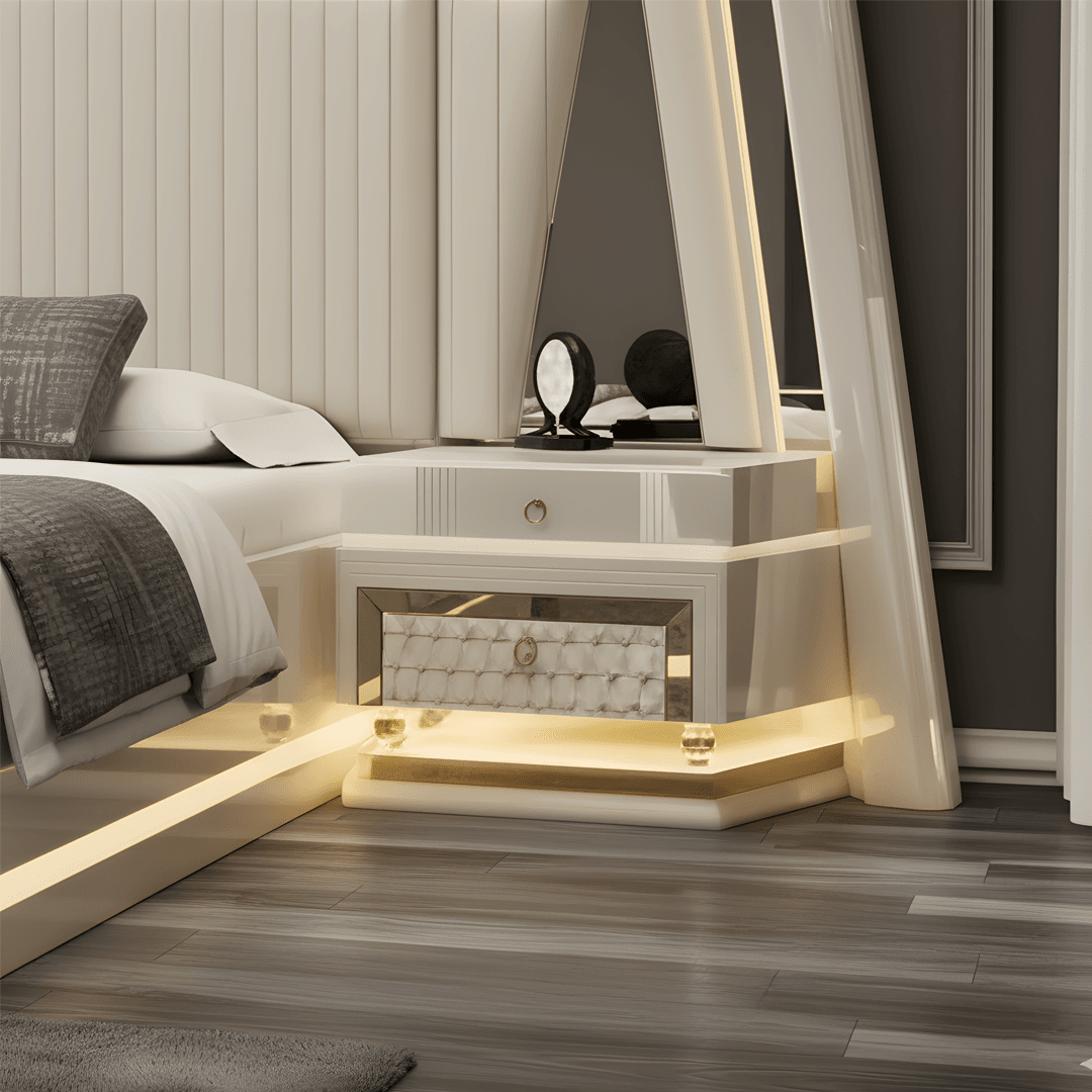 What makes the Driftwood Bedroom Set truly exceptional is its integrated luxury lighting, thoughtfully placed throughout the headboard, wardrobe, and dresser. These ambient lights cast a gentle, inviting glow, adding warmth and a touch of glamour to your room. Redefine your personal retreat with the perfect blend of quality, style, and comfort—choose the Driftwood Bedroom Set for a bedroom that inspires relaxation and refined living.