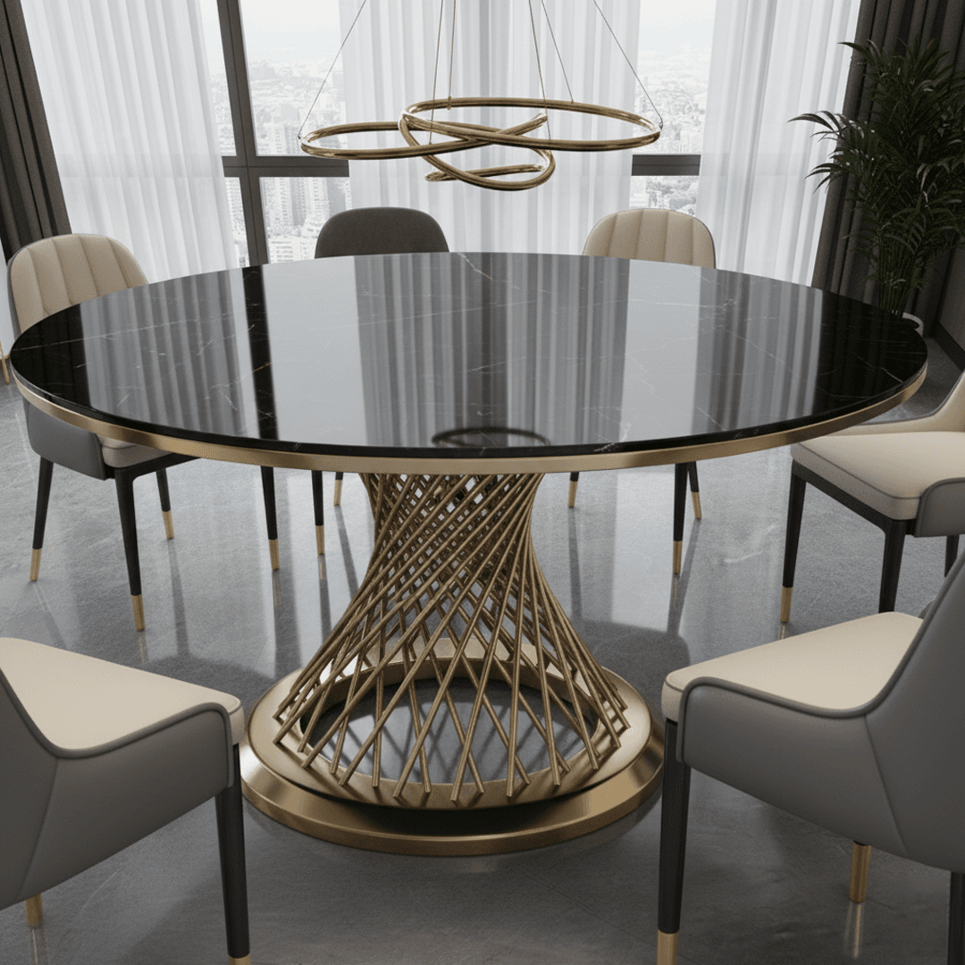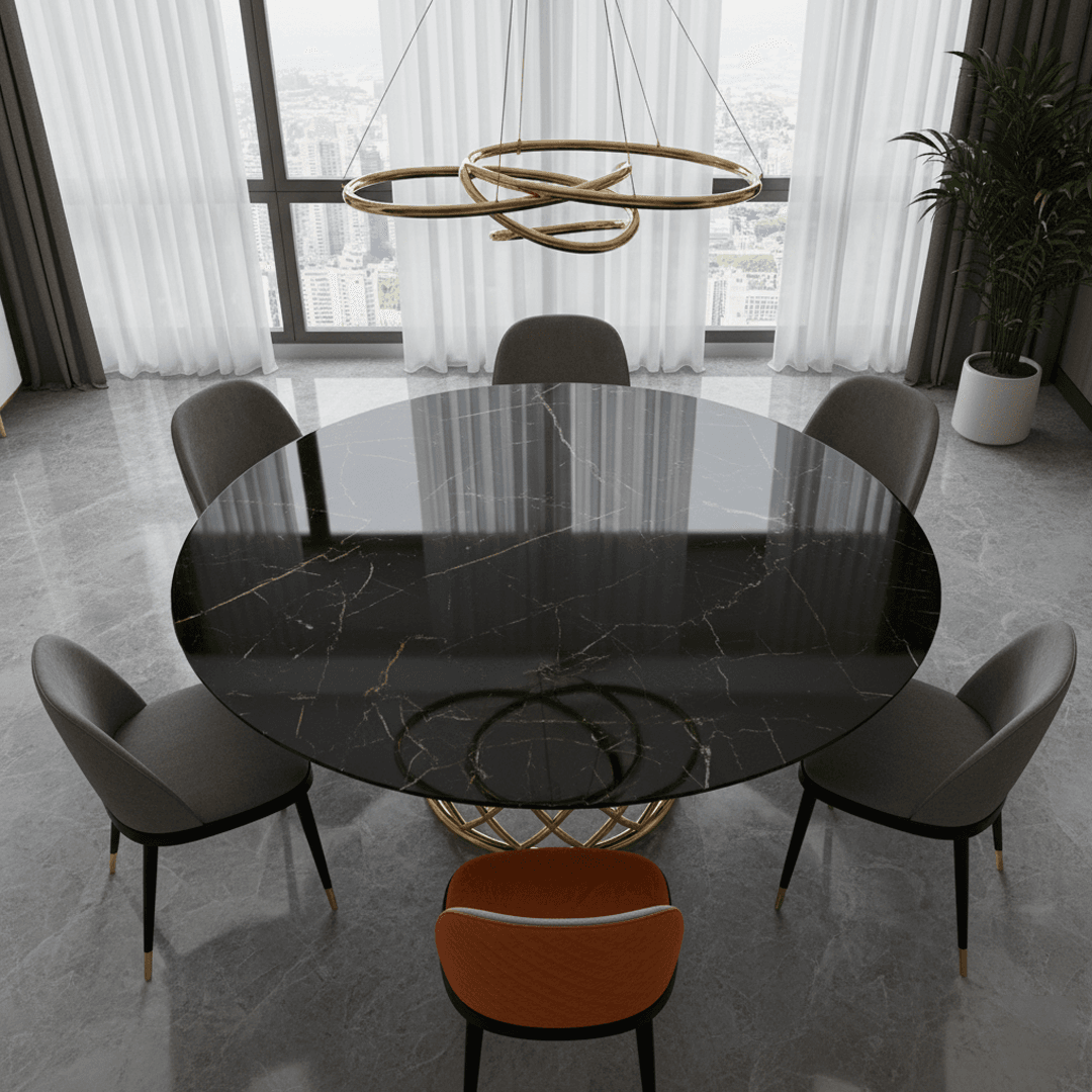 This stunning round dining table is a true statement piece, designed to be the focal point of any modern luxury dining space. Its elegant black sintered stone tabletop, subtly veined with lighter natural patterns, exudes sophistication and provides a durable, easy-to-clean surface perfect for both everyday meals and grand entertaining. The rich, dark surface beautifully reflects light, adding depth and a touch of drama to the room.