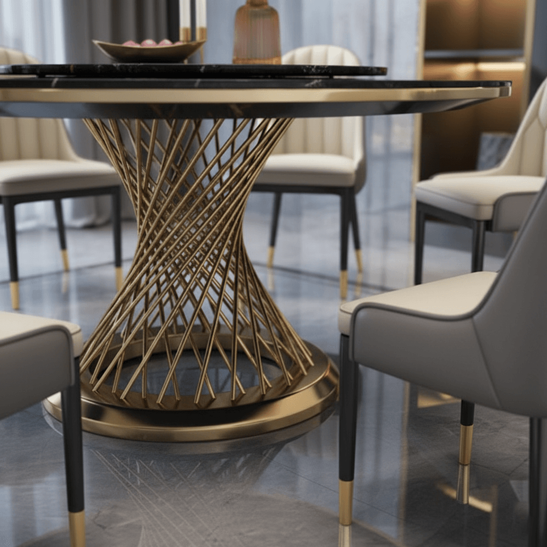 What truly sets this table apart is its captivating base. Crafted from lustrous gold-finished stainless steel, the base features an intricate, sculptural design reminiscent of a twisted spiral. This artistic element not only provides robust support but also transforms the table into a piece of functional art, drawing the eye and sparking conversation. Paired with minimalist chairs featuring cream and dark grey upholstery and matching gold accents on their legs, the ensemble achieves a harmonious balance of comfort and high-end design.